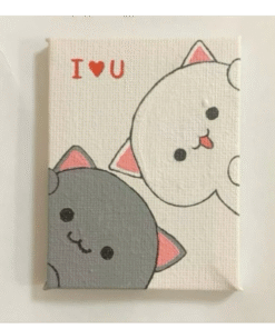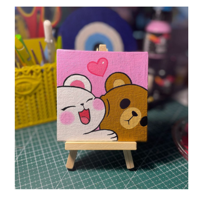 Add a splash of cuteness to your space with this handcrafted mini canvas painting featuring an adorable bunny and bear sharing a warm, cheerful hug — complete with a pop of pink and a floating heart!